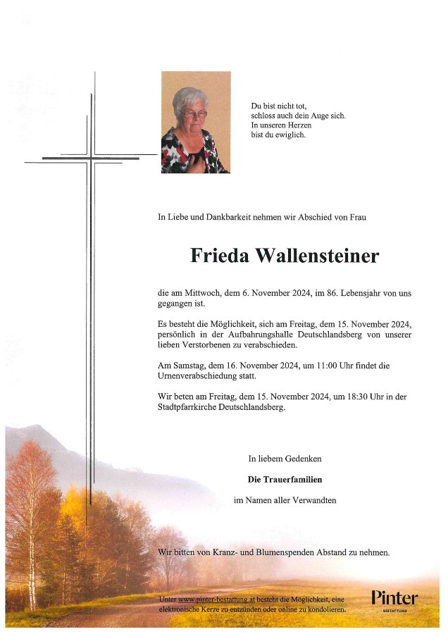 es ist schon lange her, dass du uns das letzte Mal in deiner Heimat Osttirol besucht hast und ich dich damals persönlich gesehen habe. Aber du warst in unserer Familie immer präsent, auch wenn du nicht in Osttirol warst. Du hast mit unserer Mama Franzi einen regen Kontakt gepflegt, hast uns immer allen nachgefragt und auch mein Schicksal mit unserem kleinen Kilian hat dich sehr berührt. Deine Wünsche an uns haben mich immer gefreut und sie haben mir sehr viel bedeutet. Jetzt wird die Mama nicht mehr sagen können "einen schönen Gruß von der Tante Frieda" und das wird uns allen sehr fehlen... DU wirst uns allen fehlen!