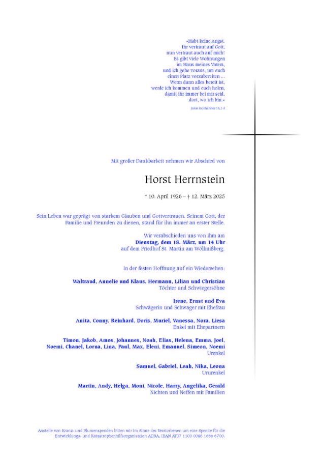 Meine aufrichtige und herzliche Anteilnahme allen Angehörigen seiner großen Familie. Bruder Herrnstein hat ein gesegnetes Alter erreicht und nun mit seiner lieben Frau wieder vereint. Ich durfte beide vor über 40 Jahren in Bogenhofen kennenlernen, sehr aufrichtige Christen.